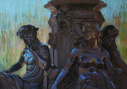 My eye is immediately drawn to the sculpted faces in this painting. The depicted mythical figures gaze at the ground or into the distance and invite me to wonder about the story they reference. The dark bronzes are rendered with subtlety, with a purposeful use of reflected color and light. I appreciate the contrast in how the background is handled, with vertical marks that beautifully diffuse detail and give the impression of falling water.