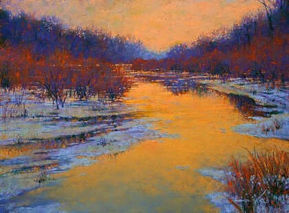 The setting sun is the focal point of this wonderful painting. Its glow filters through the foreground trees with a rim of warm color, casting cool blue shadows on the snow. Lively marks create grasses peeking through the snow cover, and their repetition pulls our eyes into the painting. Clouds and distant mountains are conveyed with fresh strokes, and accurate values hold everything together.