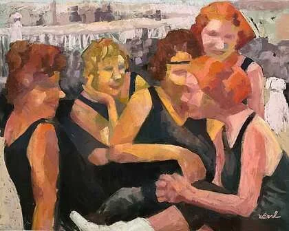 The “girls” in this fun painting are depicted in a close, happy huddle, with the overlapping planes of their individual bodies visually merging. Their expressions radiate happiness. Their fashion seems to reference a bygone era, and the sepia-toned hues of the background hint at historical context while nicely juxtaposing the strong colors and values in the foreground.