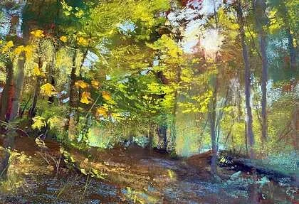 I really enjoy the way this painting uses impressionistic marks of various types to give the feel of sun filtering through trees into a forest glade. The broad side of the pastel is used to imply sifted sunlight. Thick strokes of yellow are backlit leaves, dark areas of purples and browns are organized to form shadows and tree trunks, and wispy lines are the thinnest twigs catching the light.